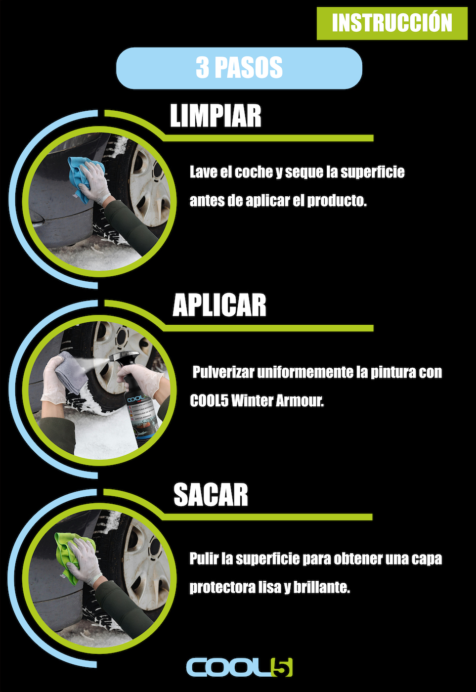 ⚠ ¡Recuerda! El uso regulardel Spray Protector Invernal Cool5 PRO XXL 1000ml crea una capa nanoprotectora e hidrófoba de base cerámica sobre todo el vehículo, ayudando a mantener el efecto protector durante más tiempo, al conducir en condiciones invernales duras protegiendo el vehículo de la humedad, la sal de la carretera y la corrosión.