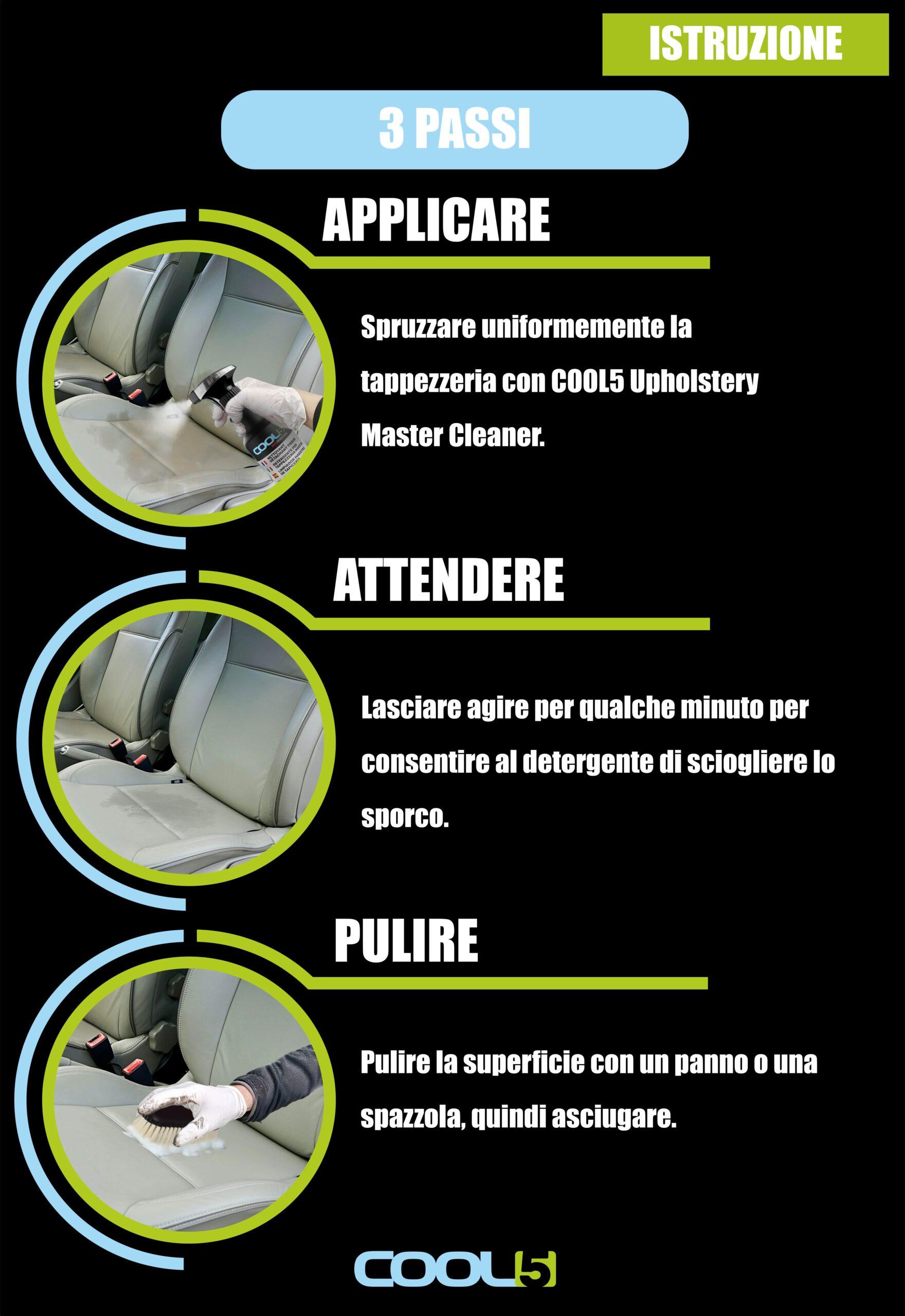 COOL5 Upholstery Master Cleaner XXL 1000 ml è un prodotto unico progettato per la pulizia completa degli interni dell’auto. Grazie alla sua formula avanzata, il prodotto rimuove efficacemente le macchie più difficili, il grasso e lo sporco dai rivestimenti in tessuto, dai fianchi delle portiere e dal padiglione. La sua azione rapida consente di lavare efficacemente gli interni, restituendo loro freschezza e aspetto estetico. Il prodotto è pronto all’uso, il che rende l’applicazione molto più semplice: basta spruzzare sulla superficie da pulire e poi strofinare con un panno o una spugna. Il prodotto è sicuro per tutte le superfici interne dell’auto, non scolorisce e non danneggia la loro struttura.