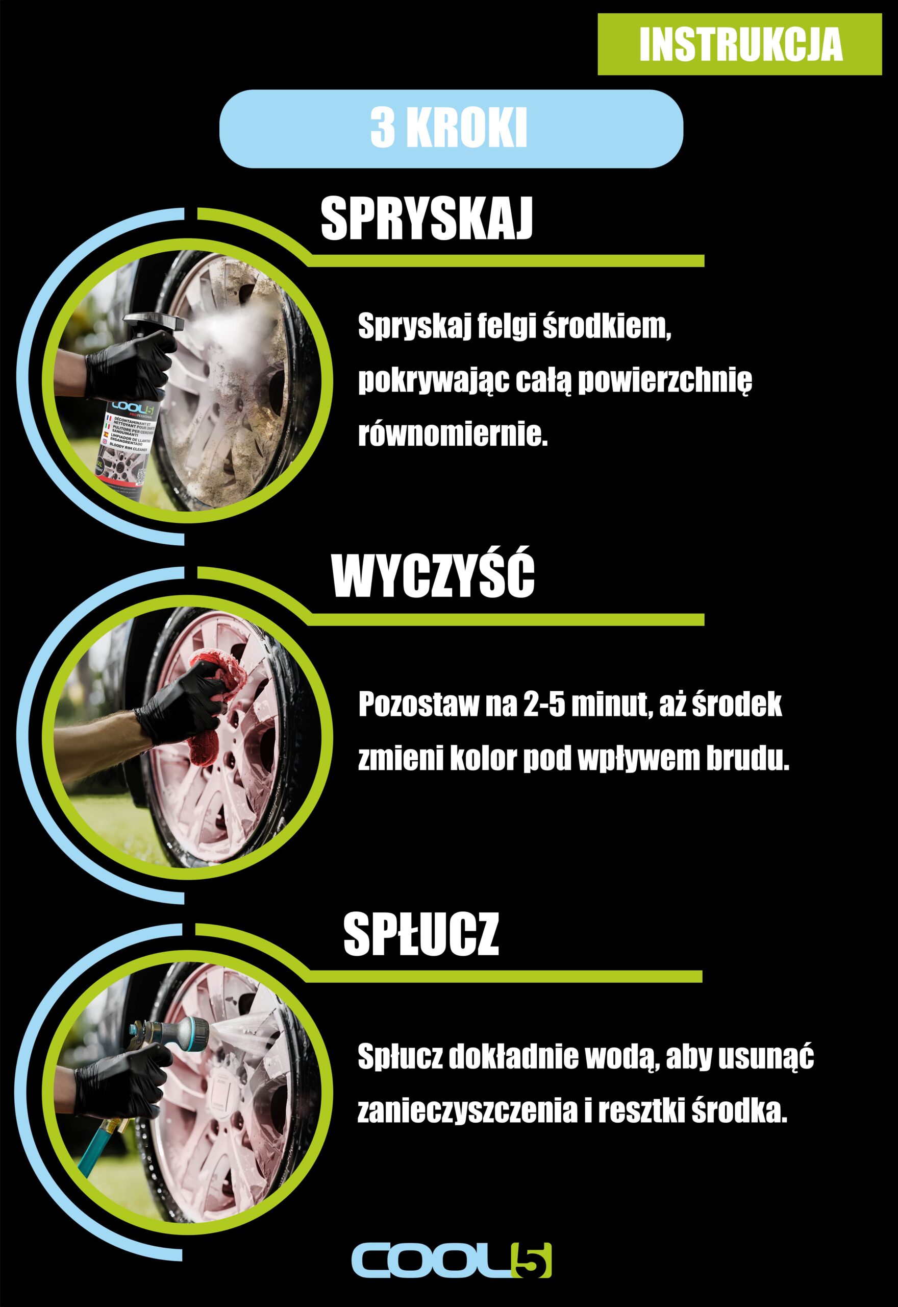 ⚠ Pamiętaj, aby nie dopuścić do wyschnięcia preparatu na powierzchni felg oraz unikać stosowania go na słońcu lub rozgrzanych elementach.